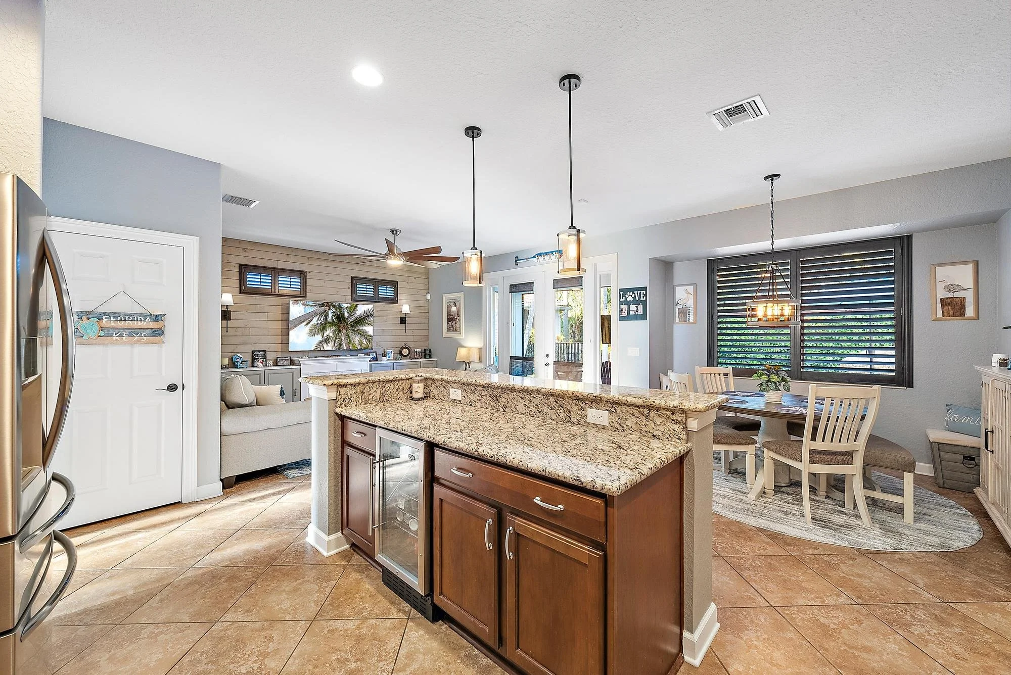 Welcome to this STUNNING 4-bedroom home in the prestigious community of The Oaks of Hobe Sound. This exceptional residence has been meticulously remodeled from top to bottom, showcasing designer touches throughout. Step through the elegant double-door entryway into a spacious foyer that sets the tone for the home's grandeur. The open layout seamlessly integrates the family room, kitchen, and dining areas, perfect for entertaining. Volume ceilings and abundant natural light highlight this sophisticated home. The recently updated kitchen features quartz countertops, 42'' wood cabinetry, stainless steel appliances, a double oven, pantry, and oversized chef's island. With its coastal-inspired decor, this kitchen is ideal for both casual meals and elaborate gatherings.