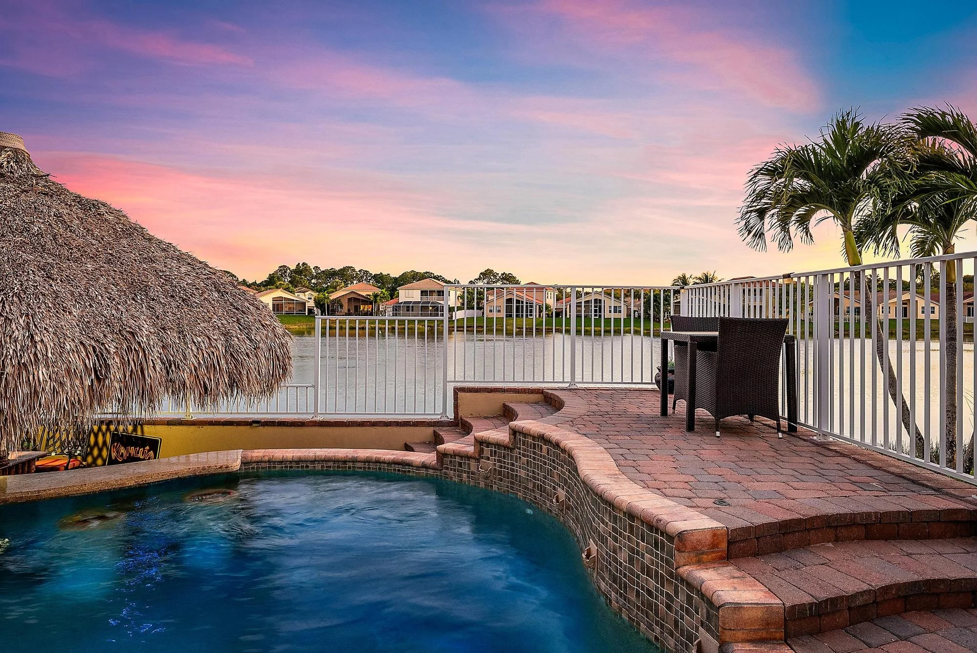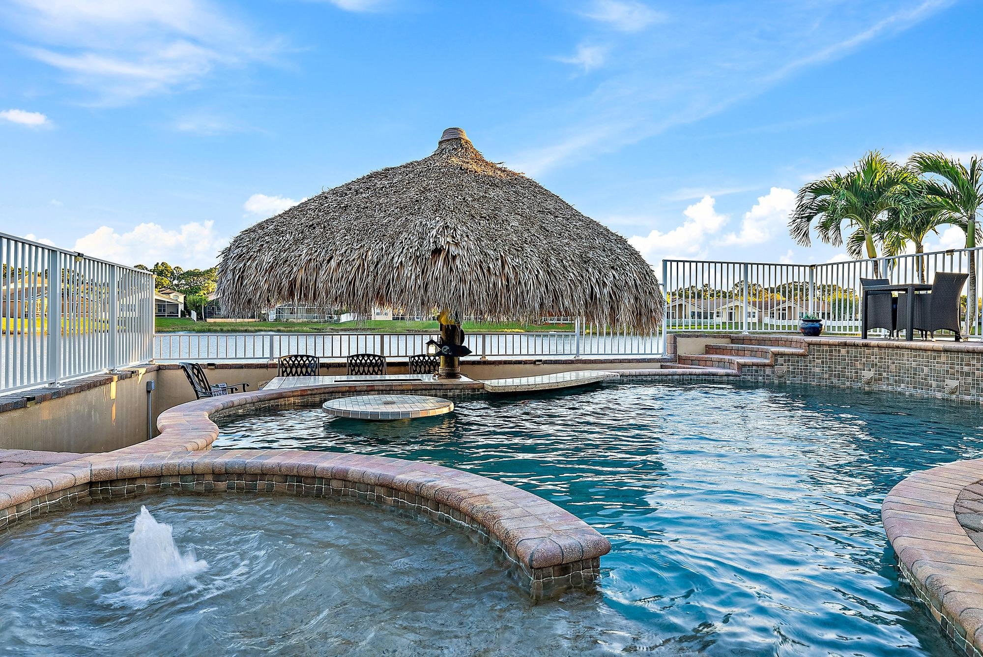 Imagine a stunning waterfront tropical oasis in Stuart, Florida. River Marina is located off the St. Lucie River with a boat ramp and ocean access. This breathtaking home sits on the lake, offering serene water views from nearly every angle of the backyard. Step outside & you'll be greeted by a resort-style saltwater pool with built-in bar. The perfect way to enjoy cocktails while keeping cool in the water. A variable-speed pump and pool heater ensure efficiency and year-round comfort. Just steps away, a newly re-thatched tiki hut provides a shaded retreat. The ideal setting to relax or entertain. The lush, meticulously landscaped grounds surround the property, with vibrant tropical vibes. This 4-bedroom CBS home, built by Lennar, features impact windows for added durability and peace of mind. Inside, you'll find newer stainless steel kitchen appliances, an upgraded water heater, and a 2020 HVAC system, ensuring modern comfort and energy efficiency, and so much more. Whether you're admiring the sunset over the lake, entertaining guests by the bar, or unwinding beneath the tiki hut, this home embodies the essence of relaxed waterfront living in Stuart. Meticulously maintained and move-in ready, it's prepared for its next owner to enjoy. The low HOA includes a gated entrance and amenities such as a clubhouse, gym, pool, playground, basketball court, and a day dock with boat ramp access to the Saint Lucie River. Perfect for those who enjoy boating, fishing and the Florida lifestyle.